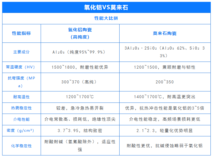 莫來(lái)石(主要成分3Al?O?·2SiO?)與氧化鋁陶瓷(主要成分Al?O?)在性能上各有側(cè)重,精準(zhǔn)匹配不同工況需求。以下是兩者的關(guān)鍵性能對(duì)比: